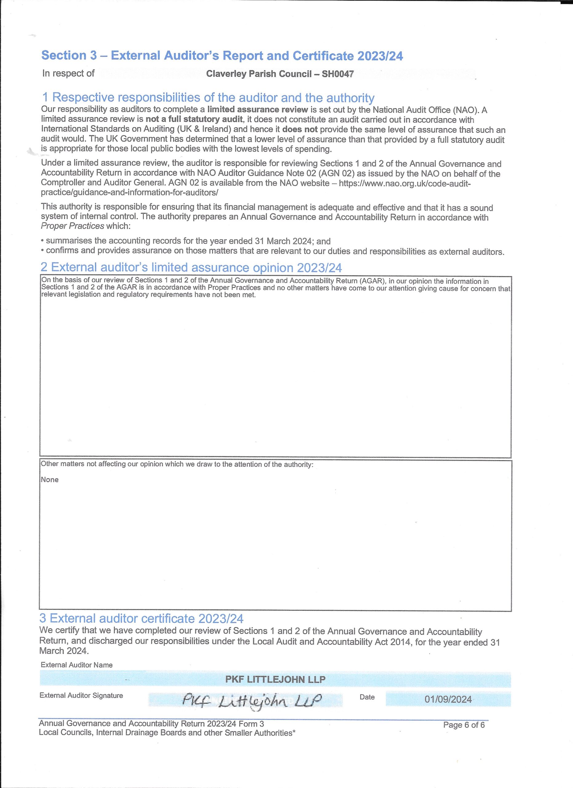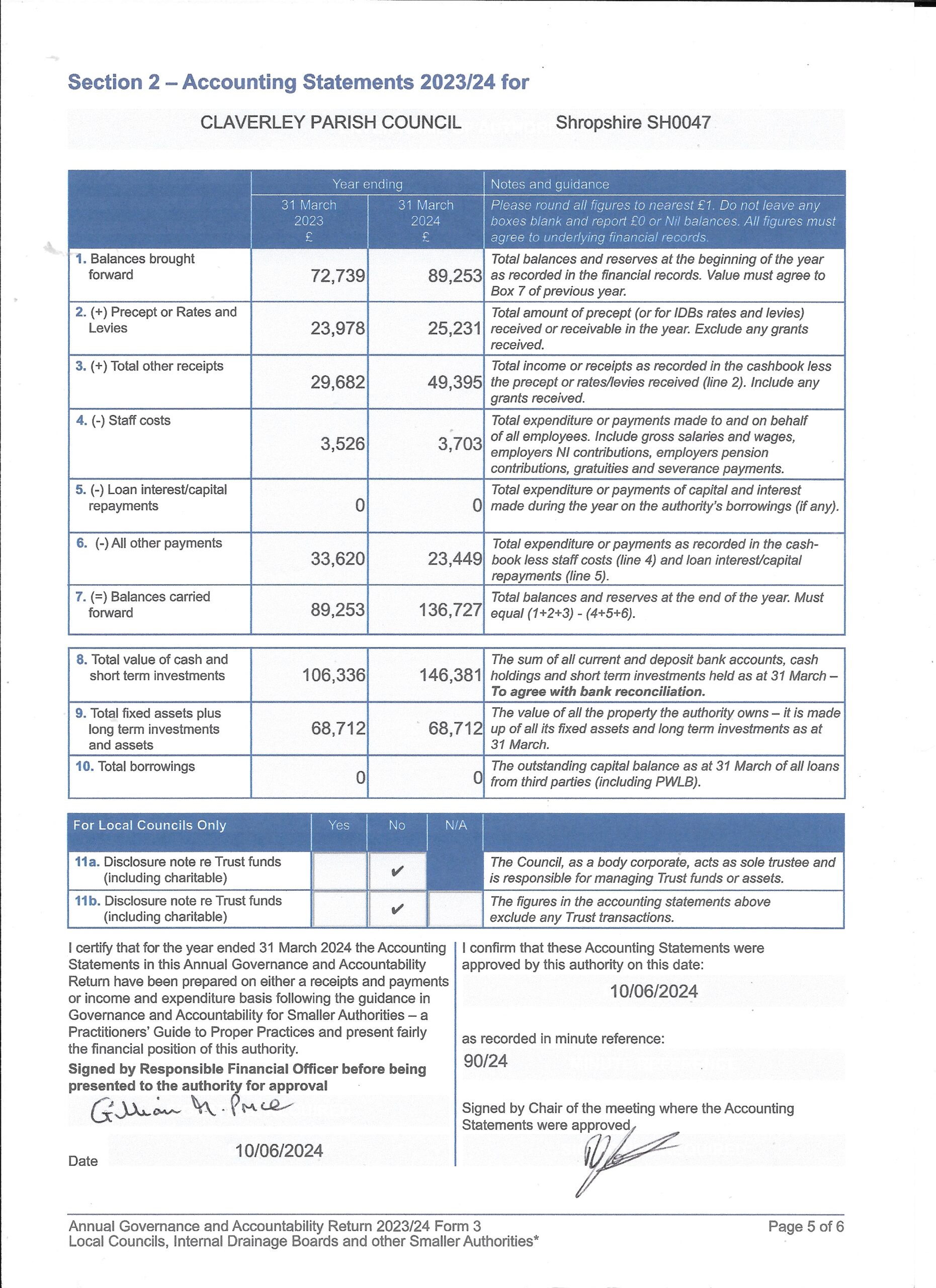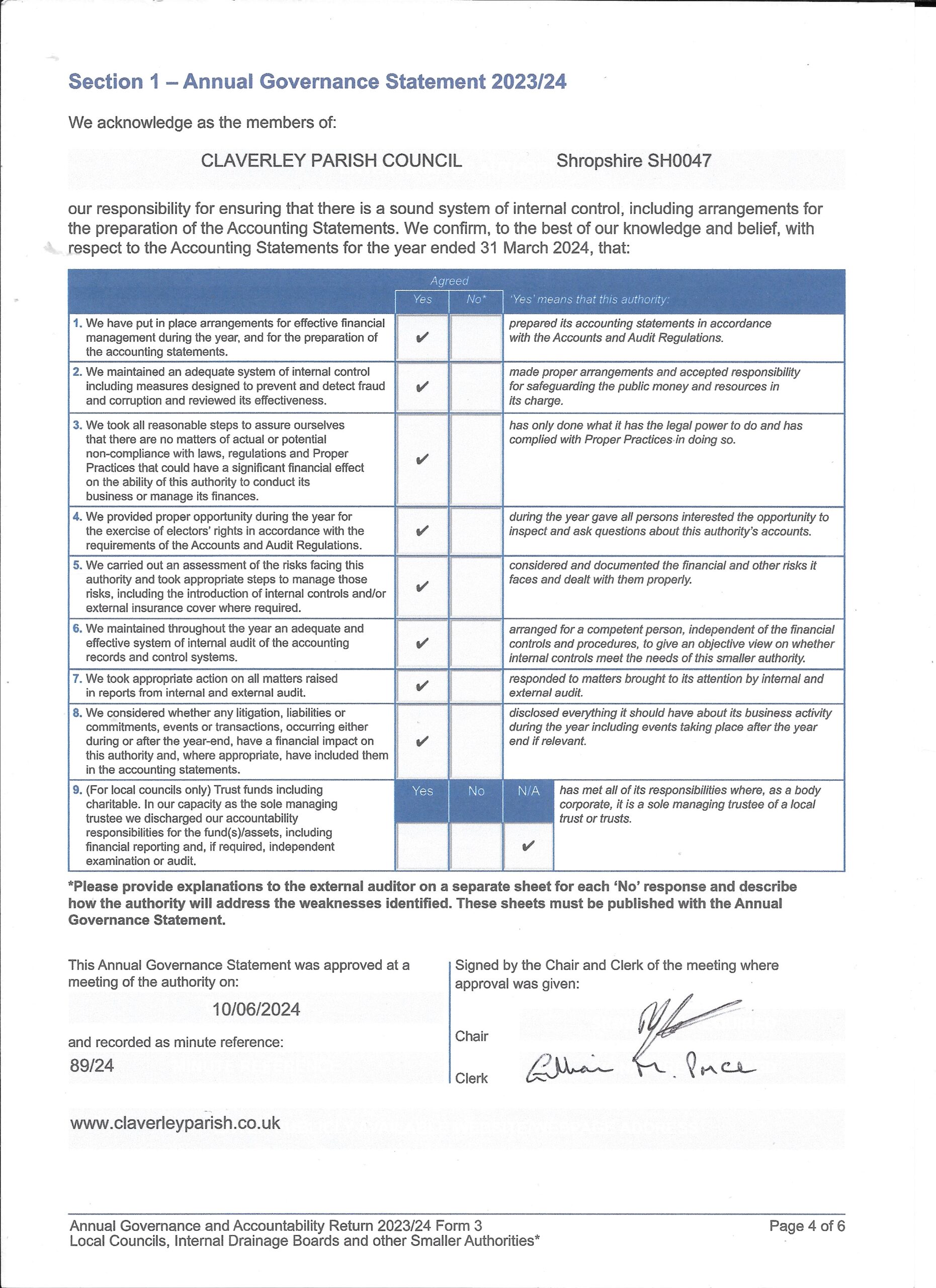 Please find attached copies of the Annual Governance and Accounting returns for 2023/24.