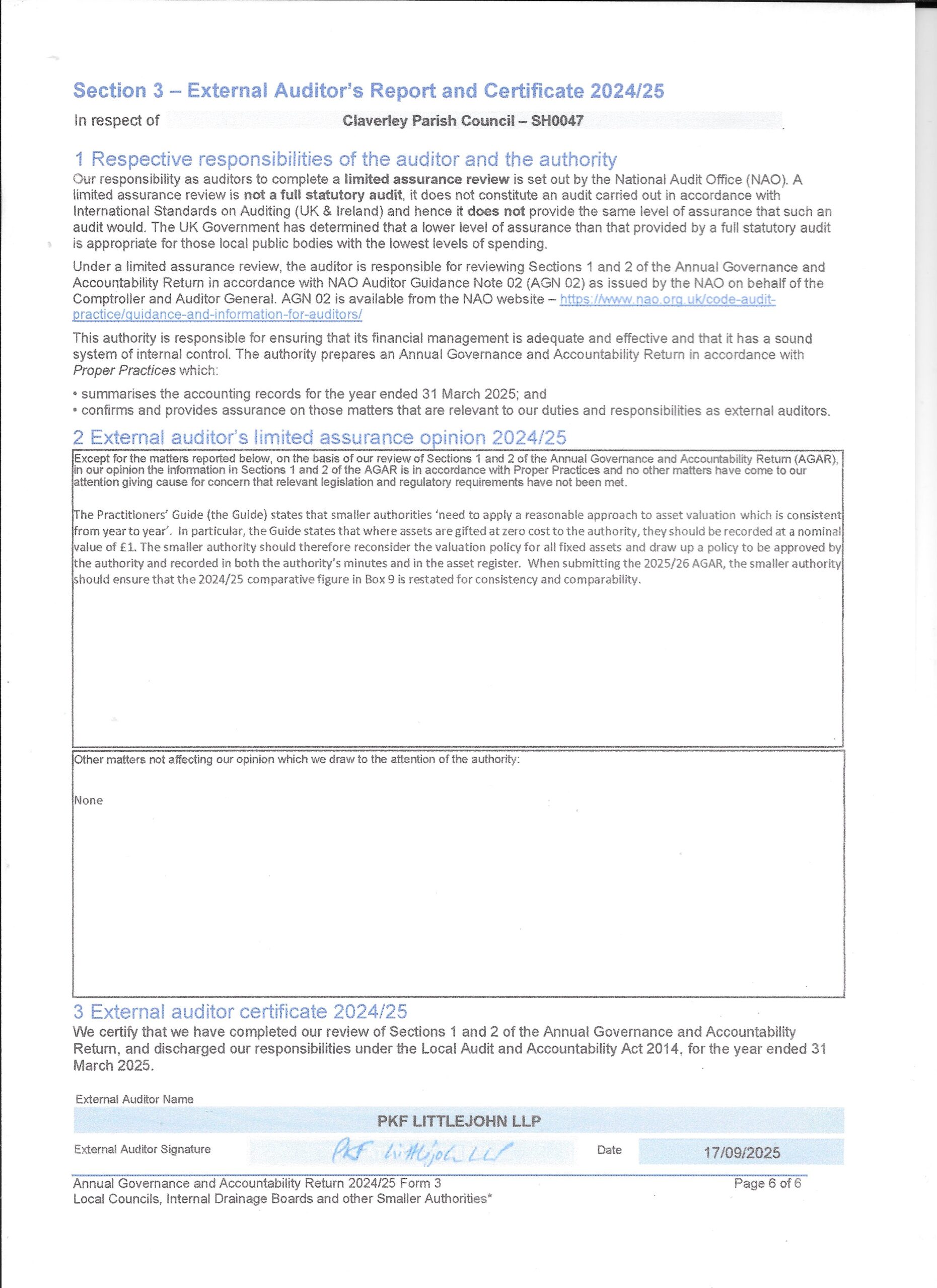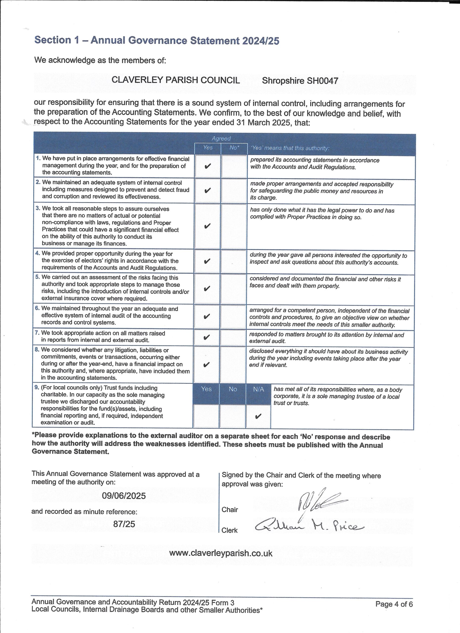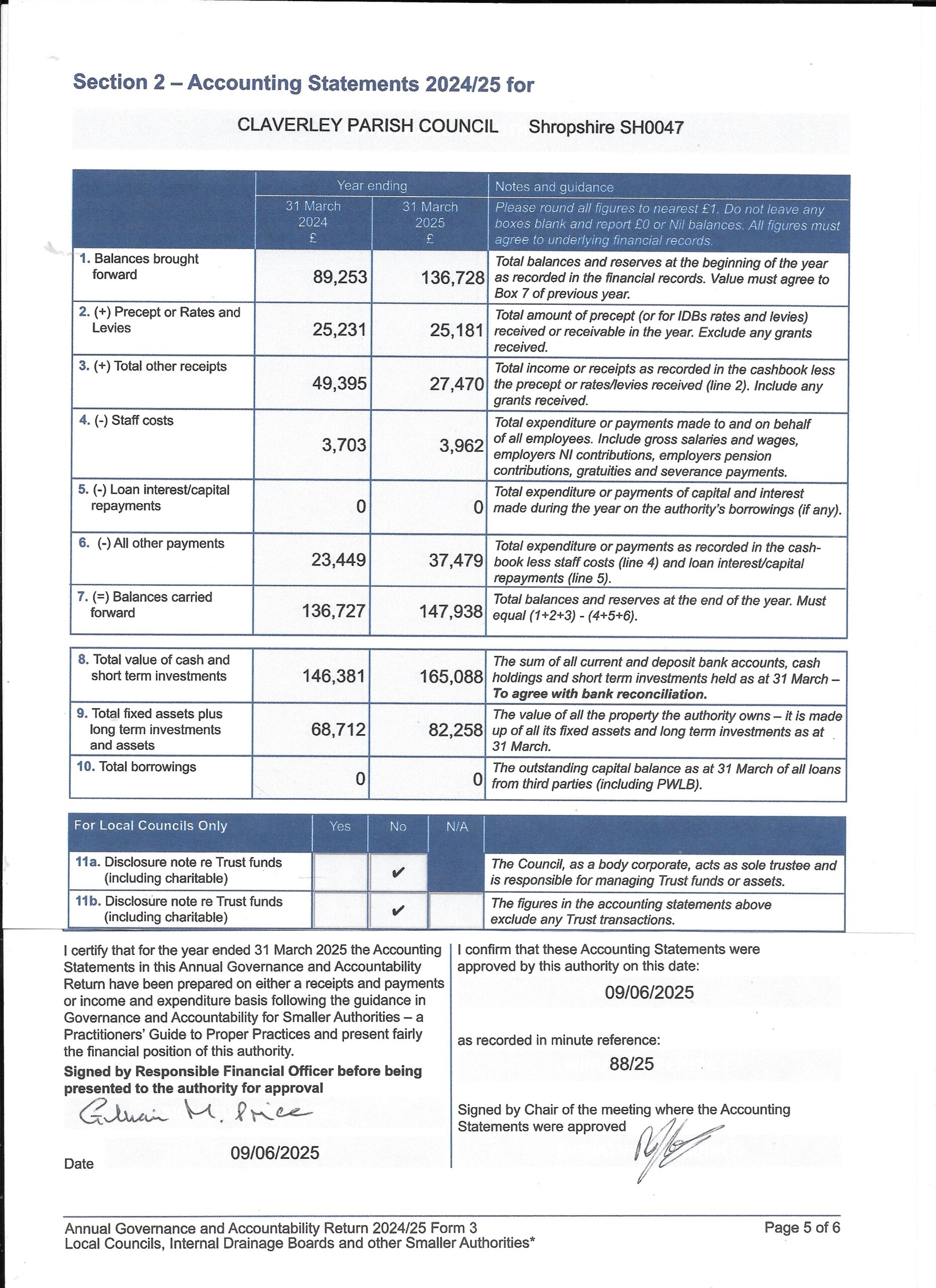 Please find attached copies of the Annual Governance and Accounting returns for 2024/25.