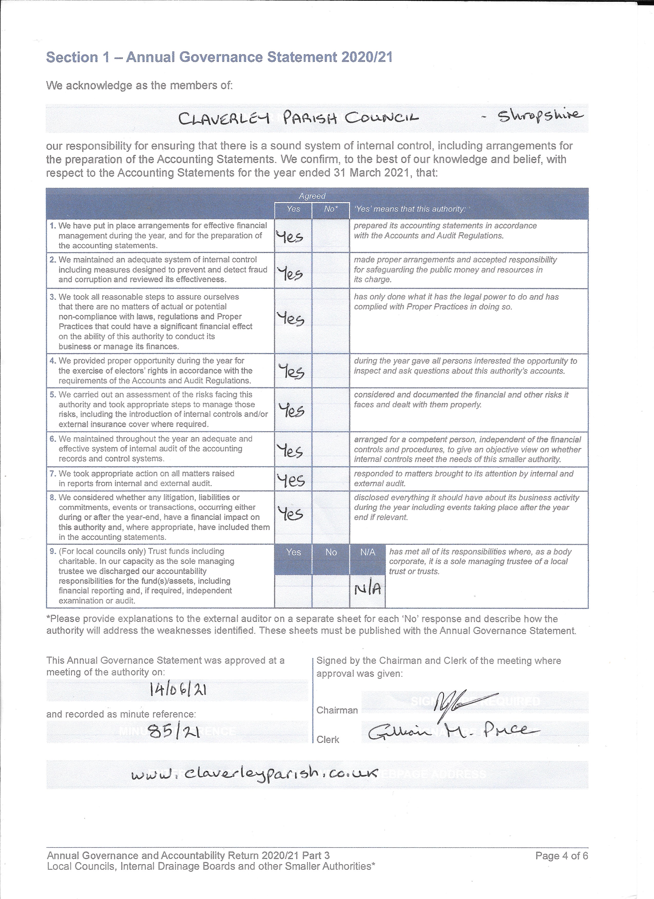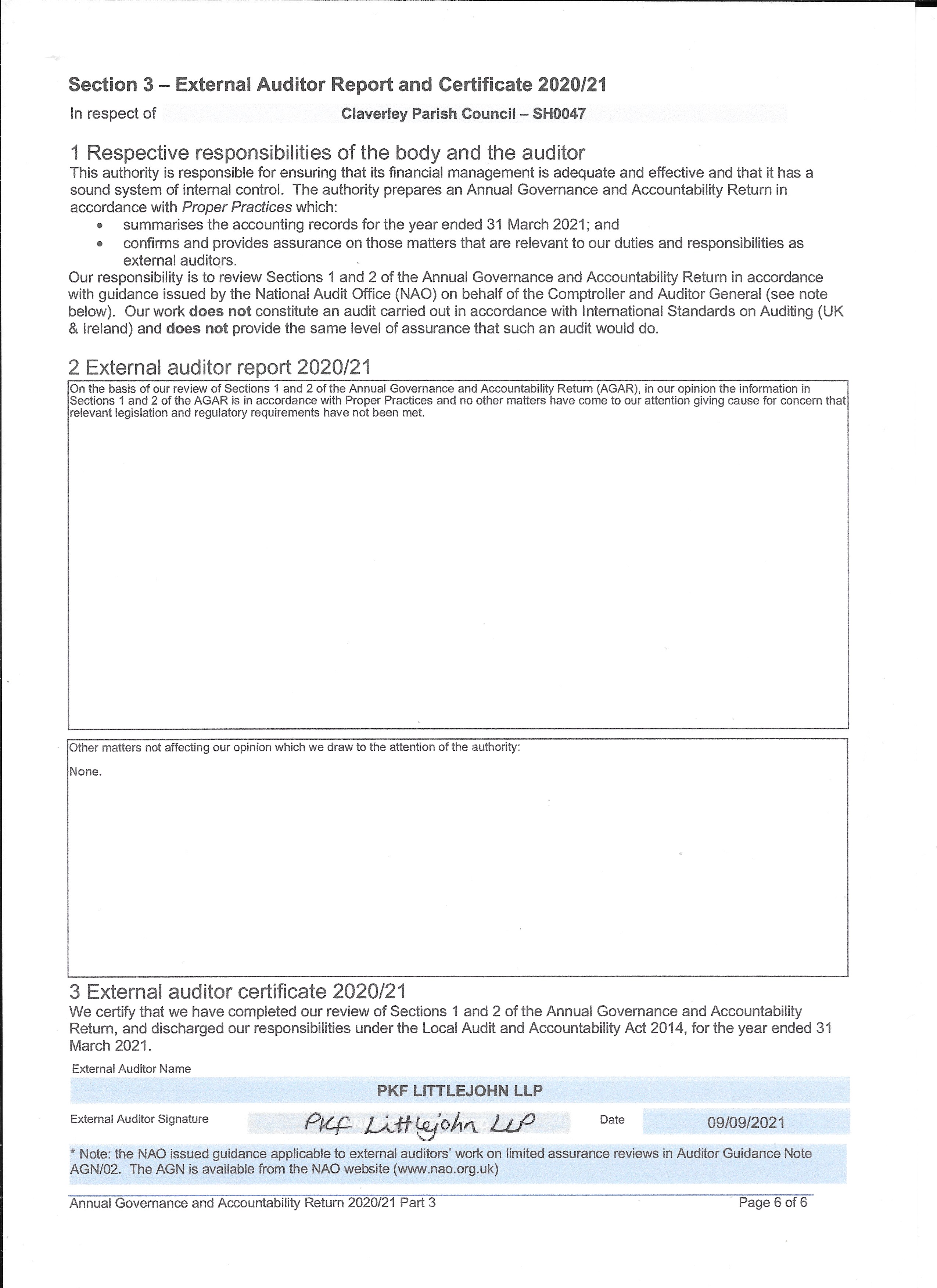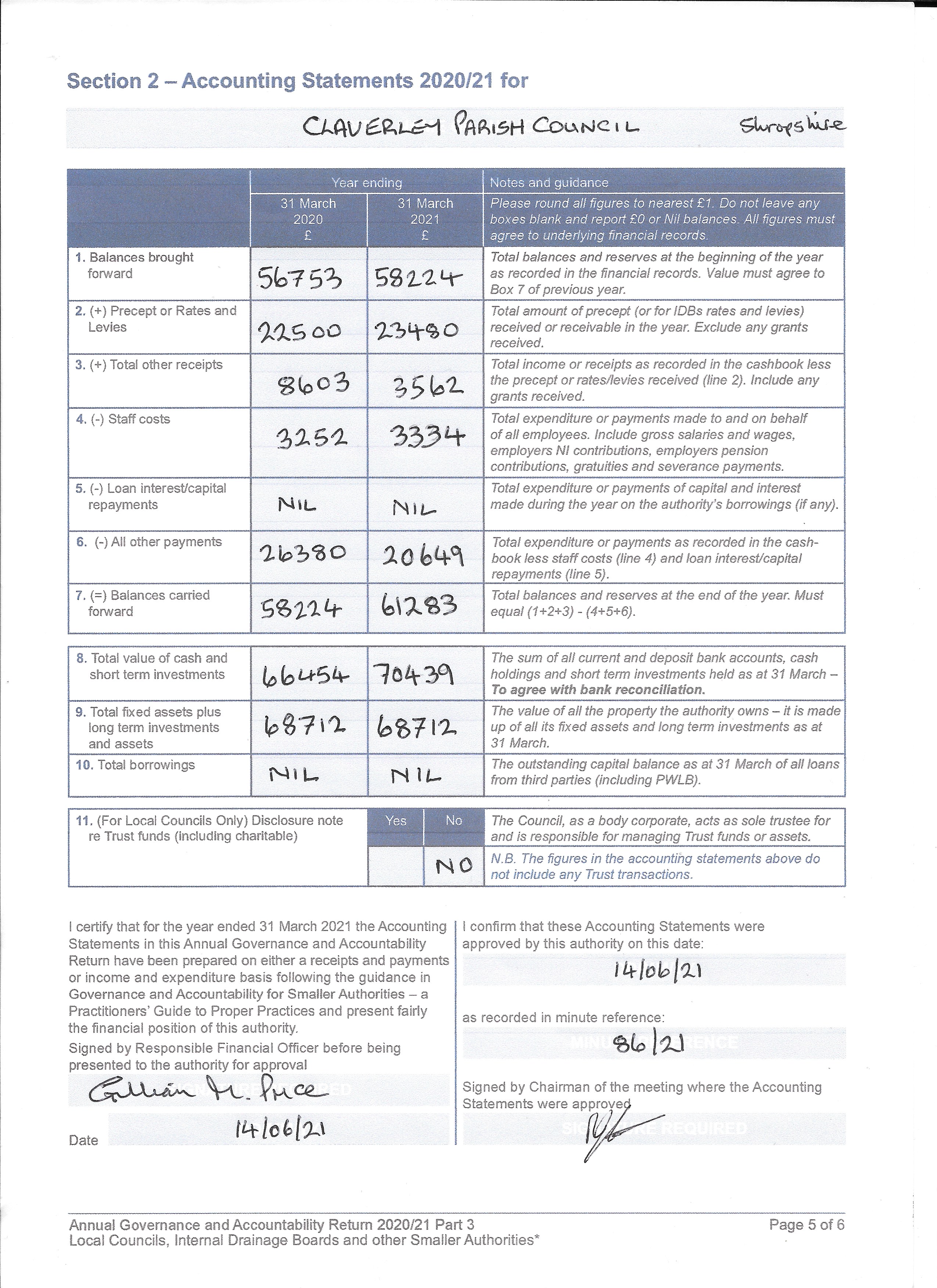 Please find attached a copy of the Annual Governance and Accounting returns for 2020 / 21.