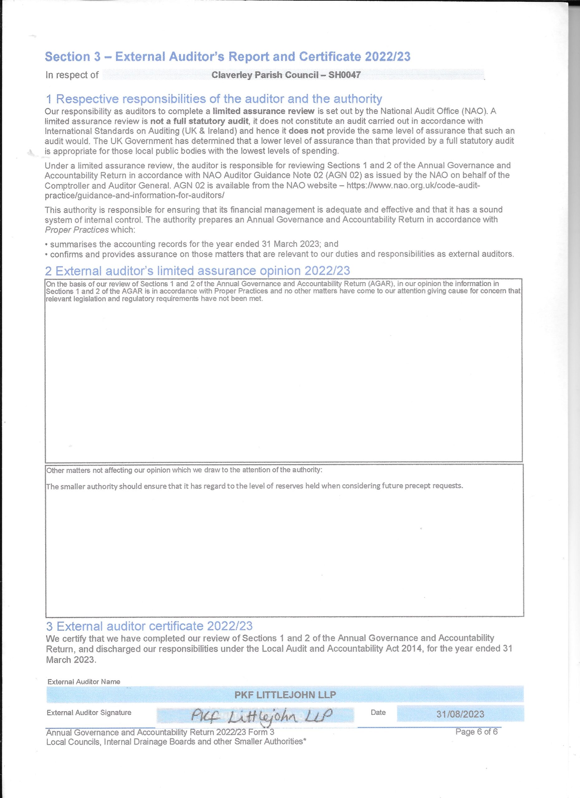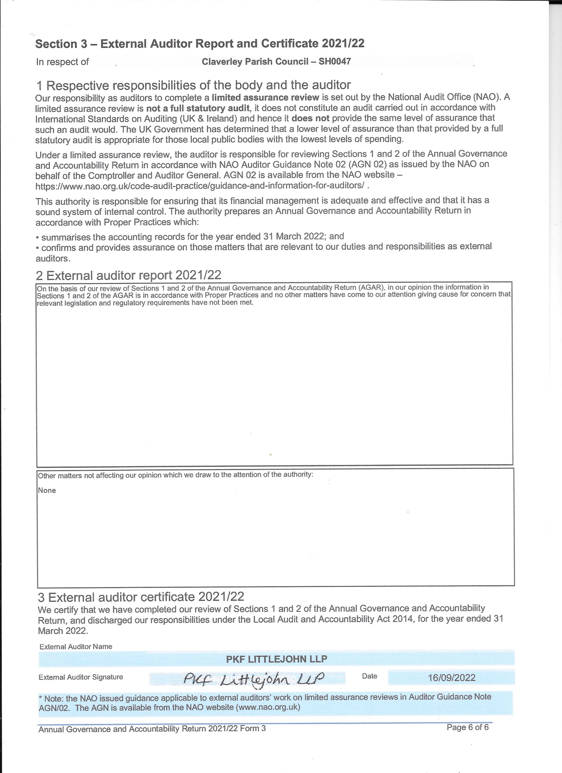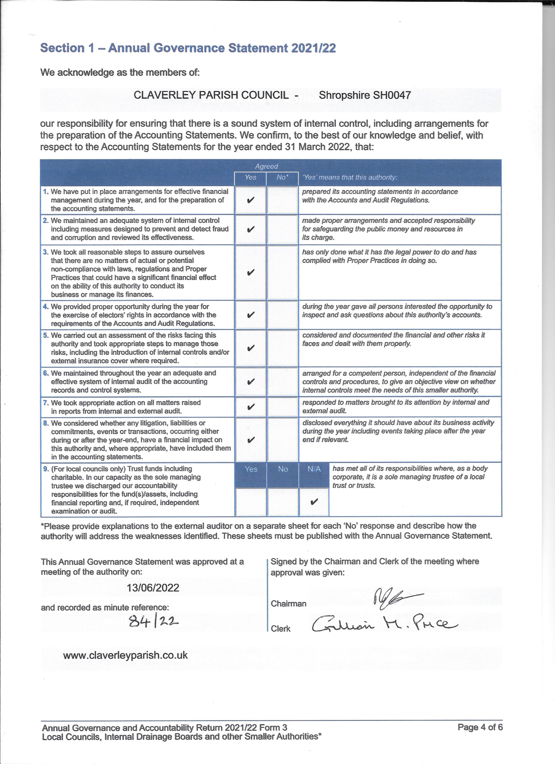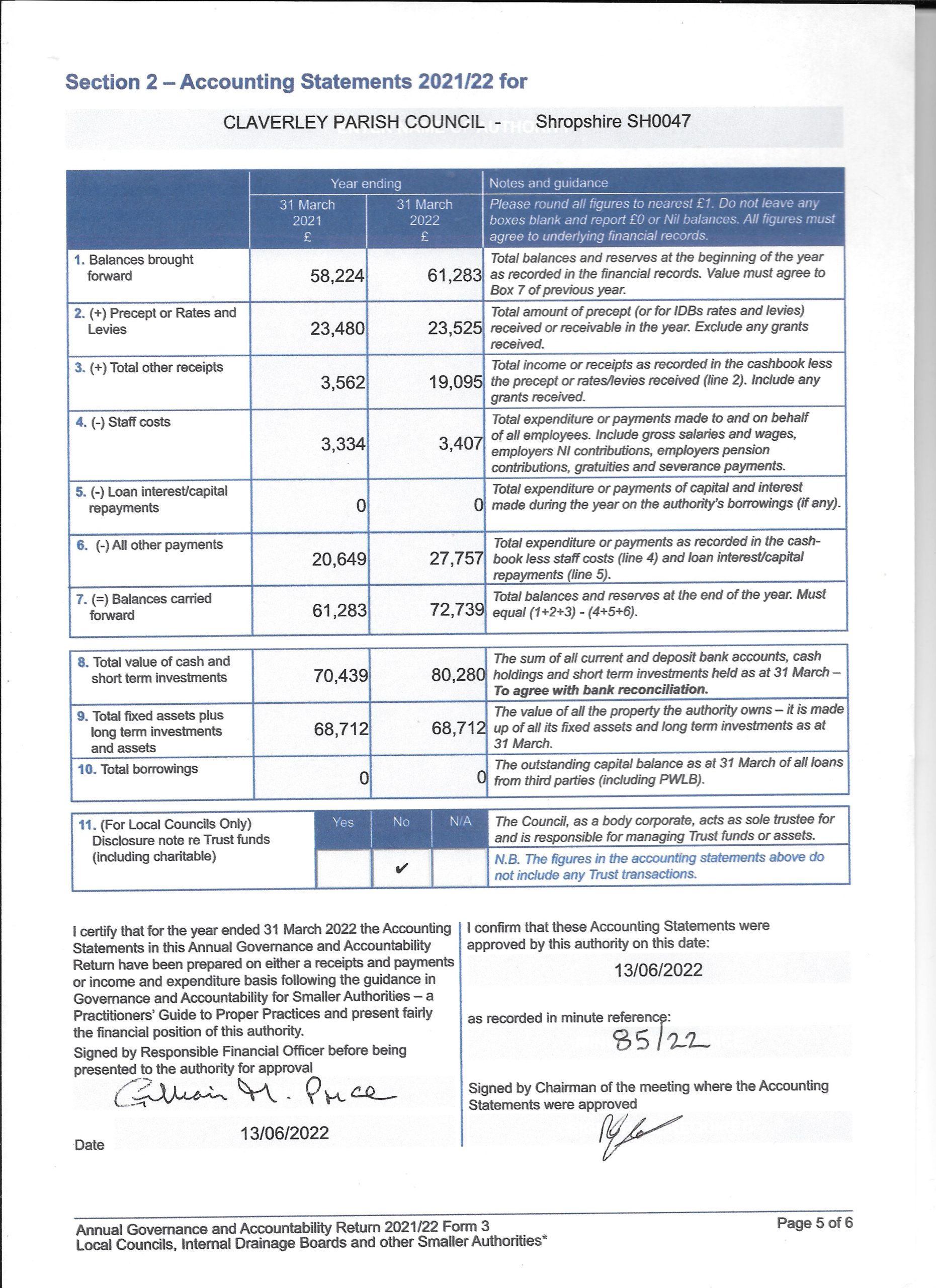 Please find attached a copy of the Annual Governance and Accounting returns for 2021/22.